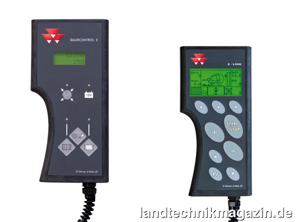 Für die Bedienung der neuen MF RB Rundballenpressen hat Massey Ferguson verschiedene Terminals konzipiert. So werden die Festkammerpressen MF RB 1125F und 2125F mit dem einfachen Überwachungsmonitor Balecontrol E gesteuert, mit dem die manuelle oder automatische Bindung aktiviert wird und der die Anzahl der Ballen pro Tag sowie die Gesamtballenzahl berechnet. Die MF RB 2125FPR wird mit dem E-Link-Terminal überwacht (das optional auch für die 2125F erhältlich ist), das die Vorauswahl der hydraulischen Funktionen sowie die Steuerung von Ballendichte sowie Netzlänge und die Auswahl der Messergruppen ermöglicht und Arbeitszeit sowie den Stand verschiedenster Ballenzähler anzeigt. Standardmäßig verfügen die variablen Pressen MF RB 4160V und 4180V (Classic und Xtracut) über ein E-Link-Steuerungssystem, das allerdings nicht identisch mit dem der Festkammerpressen ist. Hiermit wird unter anderem die Messerauswahl, der Ballendruck, der Ballendurchmesser und die Dauer der Netzbindung gesteuert. Optional ist die ISOBUS-Steuerung E-Link Pro verfügbar, die es ermöglicht, die wichtigsten Informationen zum Traktor und zur Ballenpresse auch gleichzeitig über das ISOBUS-Terminal des Traktors anzuzeigen.