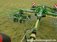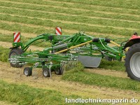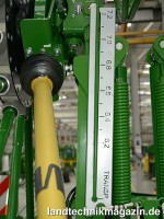 Die Arbeitsbreite der neuen McHale Doppelkreisel-Mittelschwader kann hydraulisch über die Teleskoparme vom Schleppersitz aus verstellt werden: beim Mittelschwader R 62-72 von 6,2 bis 7,2 m und beim R 68-78 von 6,8 bis 7,8 m. Beide Modelle können mehrere Mähschwade zusammenfassen oder gezettetes Gras schwaden. Den Kreiseldurchmesser des R 62-72 beziffert McHale mit 2,8 m, den des R 68-78 mit 3,2 m. Jeder Kreisel umfasst 11 respektive 13 Kreiselarme und 4 respektive 6 Tasträder. Die 10-mm-Zinken verfügen über drei Windungen, um sauberste Rechergebnisse zu liefern. Für die Anpassung an verschiedenste Erntebedingungen lässt sich die Kurvenbahn verstellen. Durch die Einstellung des Kurvenbahnwinkels, lässt sich der Zeitpunkt steuern, zu dem der Zinken das Futter freigibt. Auch die Zinkenhöhe lässt sich über eine Anzeige für die Höheneinstellung einstellen.
