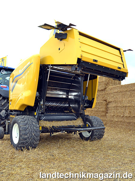 Unübersehbar ist die neue Gestaltung der Seitenverkleidung der New Holland Roll-Bar 125, die sich am Design der wunderschönen BigBaler HD orientiert. Hologramm-Aufkleber erinnern an die BR6090. Neben ästhetischen Aspekten bietet die neue Verkleidung auch praktische Vorteile: Sie lässt sich (unterstützt von Gasdruckfedern) weit nach oben öffnen und erleichtert so den Zugang zu den Wartungspunkten. Zusätzlich schafft sie Stauraum für Ersatznetzrollen.