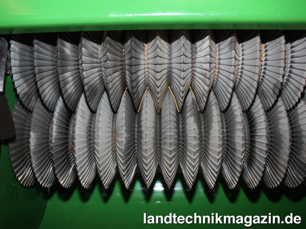 Im Gegensatz zu Aufbereitungssystemen der gleichen Bauart, die mit geraden Scheiben arbeiten, setzt der neue KernelStar auf eine patentierte Scheibenform. Dabei wird das Erntegut von den ineinander greifenden konvex geformten Scheiben der unteren Rolle und den konkaven Scheiben der oberen Rolle aufbereitet. Die Scheiben mit einem radial fördernden Zahnprofil sorgen durch die spezielle Form trotz identischer Scheibendrehzahl laut John Deere für Geschwindigkeitsdifferenzen von bis zu 50 %. „Durch die Oberflächenunterschiede der Scheiben ist die Aufbereitung der Körner intensiver. Darüber hinaus lassen sich durch diese Technik Überlängen und der Kraftaufwand für die Komponenten deutlich reduzieren“, erklärt der für Feldhäcksler zuständige Produktmanager Klaus Kellner. „Dank seines Aufbaus und der 2,7 fachen Oberfläche gegenüber herkömmlichen Systemen ermöglicht KernelStar auch bei hohen Leistungen und dicken Materialmatten eine sichere Körnerzerstörung“, so Kellner weiter.