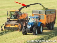 Das IntelliFill-System soll bei den neuen New Holland FR-Feldhäckslern selbst bei eingeschränkter Sicht eine genaue Füllung des Anhängers mit minimalen Verlusten ermöglichen. Mit Hilfe einer 3D-Spezialkamera (Pfeil) wird der Gutstrom so in den Anhänger gelenkt, dass eine gleichmäßige Füllung gewährleistet ist.