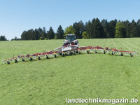 Das Fahrwerk des neuen Kreiselzettwenders HIT 16.18 T verfügt über große Räder, die nahe am Zinkeneingriff positioniert sind. Pöttinger spricht deshalb auch von „überdimensionalen Tasträdern“, die den Zetter immer perfekt über Bodenunebenheiten führen. Um trotz der großen Arbeitsbreite eine gute Bodenanpassung zu ermöglichen, gleichen sich nach Herstellerangaben alle einzelnen Rahmenelemente und damit natürlich die Kreisel unabhängig voneinander an die Bodenkontur an. Stichwort Rahmen: Die vorderen Kreisel-Schutzbügel sind als tragende Elemente ausgeführt und erhöhen so die Stabilität der Konstruktion.
