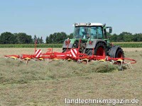 Die Pöttinger-Neuheit im Bereich Schwader ist der 4-Kreisel-Schwader Top 1252 Hybrid. Neben bewährten Ausstattungsmerkmalen wie dem „Multitast“ Tastrad für perfekte Bodenanpassung, zeichnet sich der Top 1252 Hybrid vor allem durch die völlig neu entwickelte Hybrid-Technik aus. Bei dieser Hybrid-Technik werden die vorderen Kreisel hydraulisch und die hinteren mechanisch angetrieben. Durch den hydraulischen Antrieb der vorderen Kreisel ist es möglich, die Auslegerarme für eine Transporthöhe von nur 4 m ohne Abnehmen von Zinkenarmen oder Klappen von Schutzbügeln einzuschwenken. Ohne vom Schlepper abzusteigen kann damit vom Feld auf die Straße gefahren werden, lästige Rüstzeiten entfallen. Die Arbeitsbreite des neuen 4-Kreisel-Schwaders kann einfach von 9,50 bis 12,50 m verstellt werden. Die staubdicht gekapselte Steuereinheit des neuen Top 1252 Hybrid macht Ölkontrolle und Ölwechsel überflüssig und ermöglicht damit ebenso zuverlässigen Einsatz mit hohem Komfort, wie die das gekapselte, mit Fließfett dauergeschmierte Kreiselgetriebe. Für einfache Wartung respektive Reparatur sorgt Pöttinger beim Top 1252 Hybrid auch durch eine weitere Neuerung: Bei Bedarf lässt sich die Steuerwelle mit Steuerrolle einfach und schnell durch Lösen von lediglich zwei Schrauben austauschen.