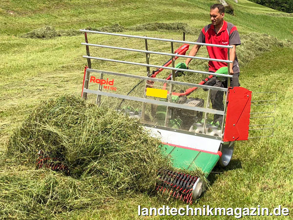 Rapid empfiehlt seine Multi-Twister zur Aufnahme und zum Transport von Erntegut in Hanglagen und in der Ebene; durch die aktive Querförderung ist auch Schwaden möglich.