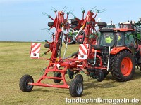 Der Vicon Fanex 904C verfügt über acht Kreisel mit jeweils sechs Zinkenarmen, die an einem kastenförmigen Rahmen montiert sind. Die flachen und stabilen Zinkenarme sollen auch mit schweren und großen Erntemassen bestens zurechtkommen und eine gleichmäßige und luftige Ablage des Erntegutes erzielen. Während die inneren Kreisel über wartungsfreie Doppelkreuzgelenke angetrieben werden kommen bei den äußeren Kreiseln, wie eingangs erwähnt, HexaLink Fingerkupplungen zum Einsatz, die für spielfreien Antrieb der Kreisel sorgen und sich 180° klappen lassen. Durch diese Klappmöglichkeit gestalten sich die Transportmaße mit 2,94 m Transportbreite und 3,74 m Transporthöhe äußerst kompakt.