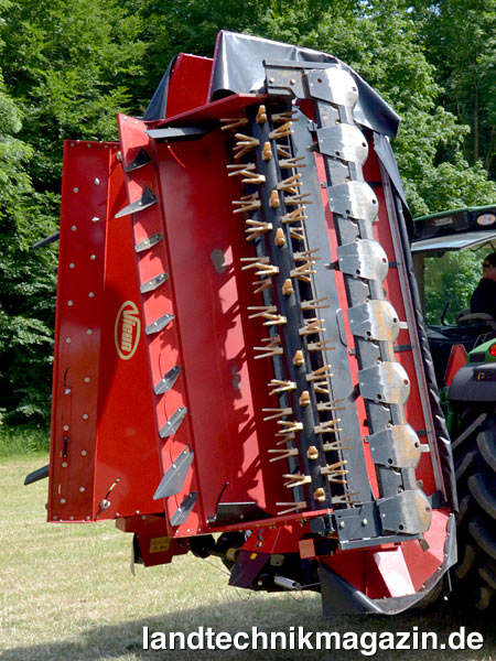 Die neue Vicon Butterfly-Mähwerkskombination EXTRA 687T Farmer ist mit zwei mittig aufgehängten Mäheinheiten mit je 3,20 m Breite ausgestattet, die durch große Spiralfedern an den Auslegerarmen für eine gleichmäßige Mähwerksentlastung über die gesamte Arbeitsbreite sorgen sollen. Neben dieser serienmäßigen Lösung bietet Vicon optional auch eine hydraulische Auflagedruckregelung an. Jede der Mäheinheiten arbeitet mit acht dreieckigen Mähscheiben, der Mähbalken ist nach Herstellerangaben komplett verschweißt. Um die optimale Überlappung mit dem Frontmähwerk sicherzustellen, lassen dich die Heckmähwerke in zwei verschiedenen Positionen montieren.