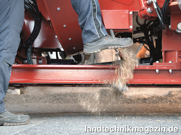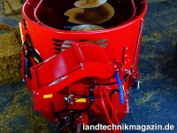 Das neue BvL V-COMFORT Turbo Strohgebläse ist deutlich größer als sein Vorgänger – der Durchmesser wurde von 1,1 auf 1,5 m vergrößert und die Gehäusetiefe wurde auf 350 mm erhöht. Die neuen Dimensionen ermöglichen es, ein größeres Flügelrad unterzubringen, das nach Herstellerangaben mehr Leistung bietet und zusätzlich ein Windrad zu integrieren, das die Wurfweite erhöht sowie den Zuführprozess zum Strohgebläse erleichtert. Ein neues Antriebskonzept ermöglicht es, trotz der größeren Außenmaße das neue BvL V-COMFORT Turbo Strohgebläse an den Mischbehäter zu rücken und so das Rangieren zu erleichtern. Der Antrieb setzt nun auf eine Gelenkwelle statt des vormals verwendeten Riemens. Geschaltet wird aktuell noch per Bowdenzug – ein hydraulisch schaltbare Variante ist nach Herstellerangaben in Arbeit. BvL betont, dass der neue Gelenkwellen-Antrieb mit Reibkupplung im Extremfall auch Überlastungen verhindern kann.