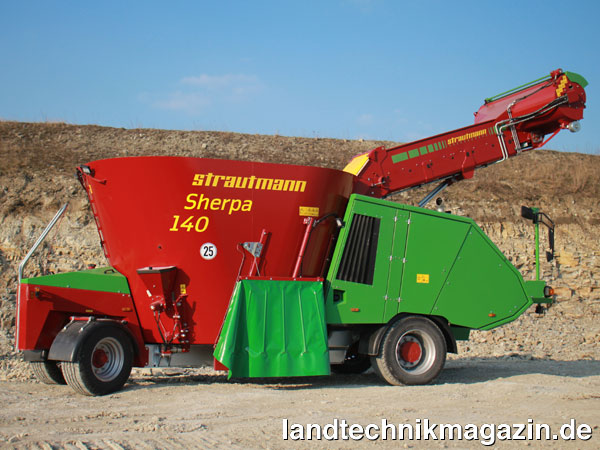 Angetrieben werden die Futtermischwagen Sherpa 120 und Sherpa 140 jetzt von einem John Deere 4-Zylinder Motor vom Typ 4045 HFC04, der die Abgasnorm der EU Stufe IV erfüllt und nach Herstellerangaben eine Leistung von 104/141 kW/PS bietet. Der neue Motor bedingt nicht zuletzt durch die Abgasnachbehandlung einen erhöhten Platzbedarf. Den Motor baut Strautmann deshalb jetzt auf der rechten Maschinenseite ein. Die Zugänglichkeit soll sich dadurch verbessern. Darüber hinaus befinden sich jetzt auch beim Sherpa 120 und Sherpa 140 – analog zu den Baureihen Verti-Mix SF und Verti-Mix Double SF – alle Hydraulikkomponenten auf der rechten Seite. Der Fahrantrieb wurde laut Strautmann durch eine mechanische Ansteuerung über Fußpedale optimiert. Die Maschine wird über eine starre Vorderachse angetrieben, die Höchstgeschwindigkeit beträgt 25 km/h. Eine Zulassung des Sherpa als selbstfahrende Arbeitsmaschine ist so nach Herstellerangaben möglich. Wie gehabt, verfügt der Sherpa auch in der neuen Generation serienmäßig über eine Hecklenkung, die ihm eine hohe Wendigkeit verleihen soll. Bei im Vergleich zum Vorgänger ansonsten unveränderten Maschinenabmaßen, hat Strautmann beim neuen Sherpa die Heckpartie schlanker gestaltet und die seitlichen Begrenzungsleuchten klappbar ausgeführt. Ebenfalls neu beim Sherpa 120 und Sherpa 140 ist der verzinkte Fahrzeugrahmen für einen optimalen Korrosionsschutz.