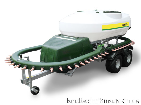 Eine Person kann mit dem neuen Milchanhänger Patura Milch-Express 30 bis 50 Kälber zur gleichen Zeit tränken, wodurch trotz großer Tierzahlen mehr Zeit für die Einzeltierbeobachtung bleibt. Zeit lässt sich auch beim Anmischen des Milchpulvers sparen – Patura gibt an, dieser Arbeitsschritt sei binnen 3 Minuten erledigt. Eine mit 4-Takt-Honda-Motor betriebene Pumpe sorgt dabei für eine optimale Durchmischung der Tränkeflüssigkeit. Auch die Reinigung ist simpel. Durch die vorhandene Selbstreinigung werden die Nuckel mit Hilfe des entstehenden Wasserdrucks einfach freigespült.