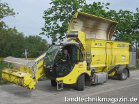 Zu den Neuheiten im Bereich der Sonderausstattungen zählt jetzt eine Abdeckung für die Mischwanne. Ziel ist es, so Sgariboldi, der Staubentwicklung entgegen zu wirken und den Staub bereits in der Wanne einzudämmen. Die Abdeckung kann je nach Bedarf hydraulisch geöffnet oder geschlossen werden. Durch diese Option ist der Selbstfahrer auch für die Fremdbefüllung, die bei flüssigen Komponenten wie etwa Melasse zum Einsatz kommt, geeignet. Bei beengten Verhältnissen erfolgt die Fremdbefüllung durch ein in die Abdeckung integriertes, separates Schiebedach, wodurch der gesamte Deckel geschlossen bleiben kann.