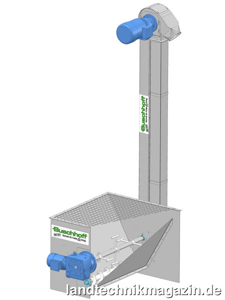 Dieser aus VA gefertigte Behälter soll nicht nur durch seine stabile Konstruktion dafür sorgen, dass das Mineral einfach aufgenommen und gelagert werden kann, sondern der BMB 360 wurde auch noch mit einem Rührwerk versehen, das von einem 0,55 kW Getriebemotor angetrieben wird. Auf diese Weise wird das Stocken des Materials (Brückenbildung) beim Dosieren verhindert. Damit die immer mehr gewünschten hohen Stunden- und Durchsatzleistungen erreicht werden können, übergibt die im Behälter integrierte Schnecke das Mineral an den hochwertigen Kettenelevator BKE 180. Austragleistungen von bis zu 100-150 kg pro Minute sind dadurch laut Buschhoff möglich.