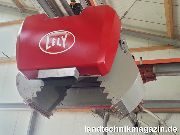 Basierend auf Erfahrungen der letzten Jahre wurde der Futtergreifer für das Lely Vector Fütterungssystem weiter optimiert. So wurde eine 3D-Kamera auf dem Greifer montiert, die Blöcke und Ballen in Breite, Tiefe und Höhe scannt. Die Futterblöcke und -ballen werden hierdurch besser erkannt, so dass der Greifer effizienter und genauer die richtige Menge Futter aufnimmt. Darüber hinaus folgt der Greifer nach Herstellerangaben dem Boden genauer, weshalb weniger Restfutter im Futtervorratsbereich zurückbleibt. Der Greifer nimmt die verschiedenen Futtersorten auf und lädt diese im richtigen Verhältnis in den Misch- und Fütterungsroboter. Der Roboter mischt das Futter, fährt selbstständig zur richtigen Stelle am Fressgitter und legt das Futter für die passende Kuhgruppe ab.
