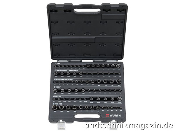 Würth liefert sein neues Torx-Werkzeugset in einem praktischen Koffer. Dieser gewährleistet laut Hersteller zum einen durch seine robuste Ausführung einen sicheren Transport beziehungsweise eine sichere Aufbewahrung des Inhalts auch unter rauen Werkstattbedingungen. Zum anderen sichert er laut Würth durch eindeutige Beschriftungen und die systemspezifische Anordnung aller Einzelteile eine hohe Übersichtlichkeit für einen zielgerichteten Zugriff.