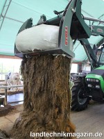Auch zum Befüllen von Futtermischwagen ist der Ballenteiler laut Stoll hervorragend einsetzbar: Der Ballen wird geteilt und fällt dann portionsweise in den Mischbehälter. Dadurch werden die Ballen im Mischwagen schneller aufgelöst, die Zeit zur Futterbereitung verkürzt sich. Selbstverständlich können auch Stroh- und Heuballen mit dem Ballenteiler halbiert werden, während das Netz von der Klemmvorrichtung gehalten wird.