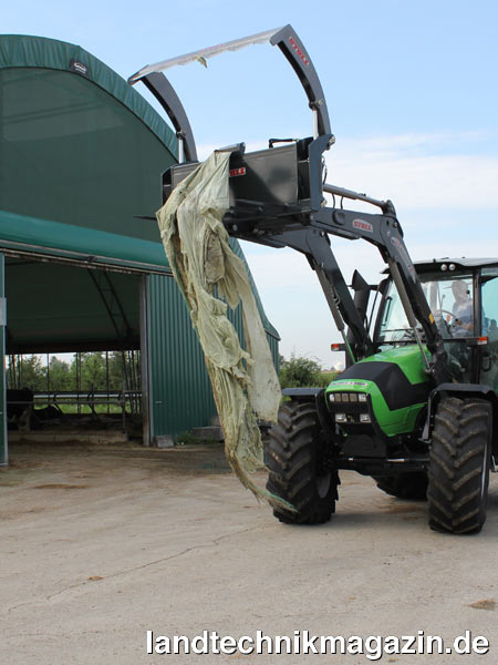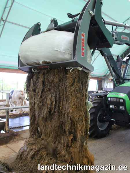 Nach der Aufnahme der Folienballen hält beim neuen Ballenteiler von Stoll eine hydraulisch gesteuerte Klammer die Folie und das Netz fest. Das Schneidmesser halbiert den Ballen und die vordere Hälfte fällt herunter. Der Traktor fährt anschließend etwas weiter und kippt die hintere Hälfte aus. Jetzt zieht er Folie und Netz zusammen heraus und legt diese am Folienlager ab. Das Ganze geschieht ohne dass der Fahrer absteigen muss. Dadurch wird, so Stoll, viel Zeit gespart und der Komfort beim Füttern steigt, da der Fahrer nicht mehr absteigen muss. Durch die Klemmvorrichtung werden die Folien und Netze sicher vom Ballen getrennt.