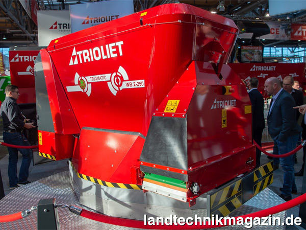 Der neue Fütterungsroboter Trioliet Triomatic WB 2 250 bezieht die Energie für seine Drehstrom-Motoren aus einer 600V-Nickel-Batterie und folgt einer Induktionsschleife oder Transpondern im Boden. Die verwendete Nickel-Batterie hat nach Unternehmensangaben eine sehr hohe Kapazität, eine lange Lebensdauer sowie kurze Ladezeiten und verursache keine Brandgefahr wie Lithium-Ionen-Batterien. Der Mischbehälter des Triomatic WB 2 250 fasst Trioliet zufolge 2,5 m³ und verfügt über zwei Mischschnecken, die nach dem Dual-Flow-Prinzip arbeiten.