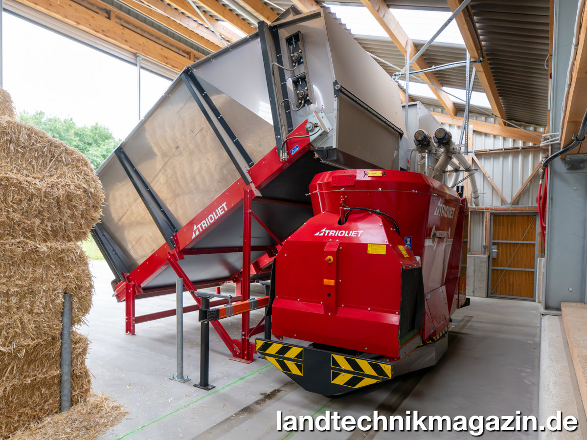Der neue Trioliet Triomatic WB 2-300 bietet ein Behältervolumen von 3 m³ und wird durch moderne Lithium-Batterietechnik bewegt. Die homogene Durchmischung auch unter anspruchsvollen Einsatzbedingungen soll vom Dual-Flow-Prinzip mit zwei Schnecken bewirkt werden. Ergänzt wird dieses Konzept durch ein patentiertes Ladeschienensystem in der Futterküche, das ein gezieltes „Zwischenmischen“ ermöglicht und damit sowohl die Mischqualität als auch die effektive Chargenkapazität signifikant erhöhen soll.
