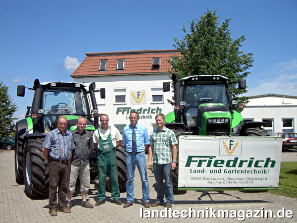 „Wir freuen uns, die Firma Friedrich, einen renommierten Fachbetrieb für Land-, Garten- und Kommunaltechnik, für den Vertrieb von Deutz-Fahr Produkten gewonnen zu haben.“ so Alexander Leopold, der Vertriebs- und Marketingdirektor von Same Deutz-Fahr in Lauingen. „Mit dem bestehenden Händlernetz und dem Neuzugang, der Fa. Friedrich, bieten wir den Deutz-Fahr Kunden und Interessenten besten Service im Großraum Leipzig.“ so Leopold weiter. Gerade bei der Firma Friedrich steht der Service an erster Stelle. So kamen 2004 und 2007 Sachsens beste Lehrlinge aus dem Hause Friedrich. Beste Vorraussetzungen also für den Vertrieb von Neumaschinen von Deutz-Fahr, die ideal zu den landwirtschaftlichen und kommunalen Kunden von Friedrich Landtechnik passen.