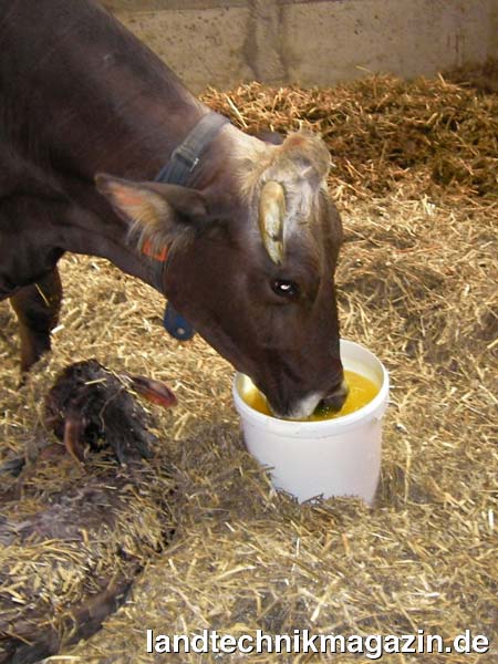 Neuartiger Calcium Trank für Kühe nach der Abkalbung zur freiwilligen Aufnahme. Er dient zur Vorbeugung von Hypokalzämie und Gebärlähmung. Die Kuh nimmt den Trank selbständig auf, eine einmalige Verabreichung ist ausreichend, und eine arbeitsintensive und mehrmalige Applikation entfällt.