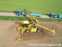 Der Gegengewichtsarm mitsamt Kraftstofftank als Gegenlast zum Überlader kann bis über 9 Meter weit und 4 Meter hoch ausgeschwenkt werden und ermöglicht dadurch auch bei verlängerter Überladeweite ein optimales Ausbalancieren der Maschine. Elektronische Messsysteme ermitteln automatisch die Gewichtsverteilung und unterstützen so den Maschinenführer (siehe auch landtechnikmagazin.de-Artikel Weltpremiere der euro-Maus 4 von ROPA zur Beet Europe in Lelystadt).