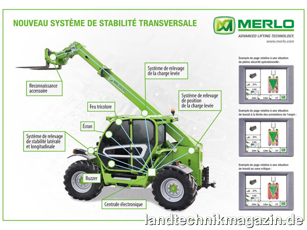 Dieses System zur Prüfung der Quer- und Längsstabilität der Maschine von Merlo garantiert die Sicherheit sowie die seitliche und rückseitige Stabilität von Teleskopladern. Zur Sicherung der Maschinenstabilität (Längsstabilität vorn/hinten, Seitenstabilität), erfasst das Merlo-System 100 Mal pro Sekunde alle wichtigen Stabilitätsparameter der Maschine: Belastung jedes Rads, Position des Teleskoparms, Teleskopierung, Winkel und angehobene Last sowie Neigung des Fahrwerks und Erkennung des am Teleskoparm befestigten Zubehörs. Die entsprechende elektronische Steuerung analysiert die Daten aller Bordsensoren und informiert den Fahrer auf einem Kabinendisplay über die Maschinenstabilität in allen Richtungen. Das System erfasst während des Betriebs kontinuierlich alle Stabilitätsparameter des Merlo Teleskopladers und reagiert entsprechend, indem es den Fahrer informiert und evtl. sogar Vorgänge blockiert, die die Stabilität der Maschine beeinträchtigen könnten. Merlo zeigt seine Produkte auf der SIMA 2015 in Halle 7, Stand E180.