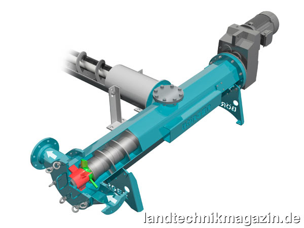 Über eine seitliche Öffnung bringt die Austragschnecke eines Mischdosierers oder eines Schubbodens die feste Biomasse in den Powerfeed connect ein. Vorhandene Technik kann hier laut Börger problemlos weiterverwendet werden. Eine Förderschnecke im Powerfeed connect transportiert die Biomasse zum Presskanal. Hier bildet sich ein Pfropfen. Der Presskanal mündet im Einspülstück des Powerfeed connect. Rotierende Messer schaben Feststoffpartikel von dem Pfropfen ab. Diese sehr feinen Feststoffpartikel werden durch sich drehende Rührflügel in den Rezirkulatstrom eindosiert. Der rundum geschlossene Powerfeed connect bietet nach Herstellerangaben eine sehr hohe Betriebssicherheit. Ein Flüssigkeitsdurchbruch ist laut Börger konstruktiv nahezu unmöglich.