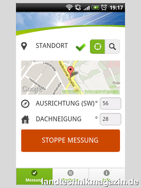 Um den möglichen Ertrag der Solaranlage zu berechnen, richtet sich der Rechner nach der durchschnittlichen Jahressonneneinstrahlung am Standort. Diesen bestimmt die Anwendung per GPS-Ortung. Moderne Mobiltelefone erkennen Neigung und Ausrichtung automatisch, sobald das Gerät am Dach anliegt. Bewegungssteuerung und Kompassfunktionen machen dies möglich. Alternativ kann der Nutzer alle Daten auch manuell eingeben.