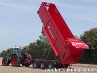 Der HTS 33.12 mit maximal 33 t zulässigem Gesamtgewicht ist das Top-Modell im Annaburger Muldenkipper-Programm und erste Wahl, wenn es im überbetrieblichen Einsatz bei Maschinengemeinschaften oder bei Lohnunternehmen und Großbetrieben um eine möglichst hohe Transportkapazität geht. Jetzt hat Annaburger diesen Tridem-Muldenkipper grundlegend überarbeitet und stellt das neue Modell EcoLiner HTS 33.12 vor. Vom bisherigen HTS 33.12 unterscheidet er sich insbesondere durch das neu entwickelte Fahrgestell mit verstärktem Rahmen sowie hydraulisch gefedertem Tridem-Fahrwerk. Um optimale Fahreigenschaften auch bei hohen Geschwindigkeiten auf unebenen Wegen zu ermöglichen, rüstet Annaburger die neue Tridem-Mulde darüber hinaus mit einer hydraulisch gefederten Deichsel aus. Neben dem Fahrkomfort kommt die hydraulische Vollfederung auch der Standsicherheit beim Kippen zugute und durch die gleichmäßige Gewichtsverteilung wird zudem der Boden geschont. Zu letzterem, wie auch zur Reduzierung des Reifenverschleißes, trägt auch die serienmäßige hydraulische Zwangslenkung der dritten Achse bei. Um bei Leerfahrten nicht unnötig Kraftstoff zu verschwenden, ist die erste Achse in Serienausstattung als Liftachse ausgeführt. Serienmäßig ist der EcoLiner HTS 33.12 mit Reifen der Dimension 600/55 R 26.5 ausgerüstet, alternative Größen sind möglich. Die dazu jeweils in der Breite passenden Kotflügel sind geschraubt.