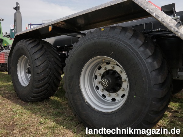 Zusätzliche Führungen und die hydraulische Verriegelung sorgen für einen perfekten Sitz und sicheren Fahrbetrieb mit Containern bis zu 7000 mm Länge. Auch beim Chassis ging Hermann Ellermann aus Ganderkesee neue Wege: Das Stützrad an der Deichsel mit Schwerlastkupplung des e-con lifter ist für eine optimale Ausrichtung zwischen Zugfahrzeug und Anhänger hydraulisch höhenverstellbar. Eine hydraulische Dämpfung zwischen Deichsel und Chassis soll Sicherheit und Fahrkomfort bieten. Die BPW-Achsen mit einer Bereifung der Dimension 560/60 R 22,5 von Alliance sind luftgefedert. Die hintere Achse des e-con lifter ist hydraulisch zwangsgelenkt und wartungsarm, damit ein anfälliges Lenkgestänge wegfällt.