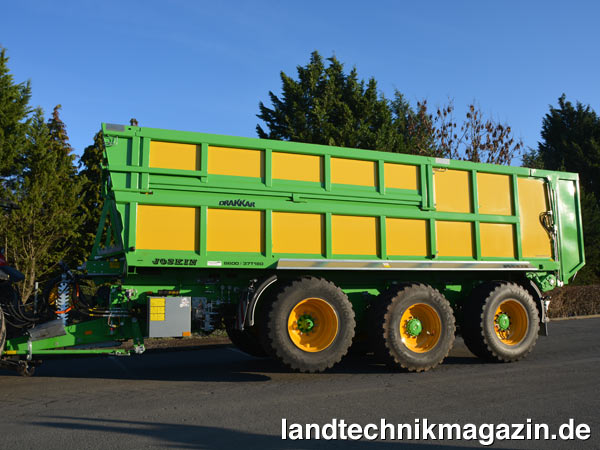 Die nun vorgestellte abklappbare Seitenwand ist laut Joskin für alle 180er Drakkar Modellen verfügbar; Joskin empfiehlt sie vor allem Kartoffelspezialisten, die ihre Ernte möglichst schonend transportieren und behandeln möchten. Die abklappbare Seitenwand wird hydraulisch betätigt und kann sowohl linksseitig als auch rechtsseitig montiert werden – eine beidseitige Montage ist zwar möglich, allerdings überschreitet das Gestänge dann die 2.550 mm Kastenbreite. Die abklappbare Seitenwand hat die Maße 4.700 x 800 mm und beginnt bei allen Modellen an der Stirnseite des Kastens. Sie wird, wie der restliche Kasten, aus UV-geschützten Polyesterharzpanelen mit Glasfaserverstärkung hergestellt, die eine kaum adhesive Oberfläche bieten und ein Verkleben von Lehm oder Erde vermeiden sollen.