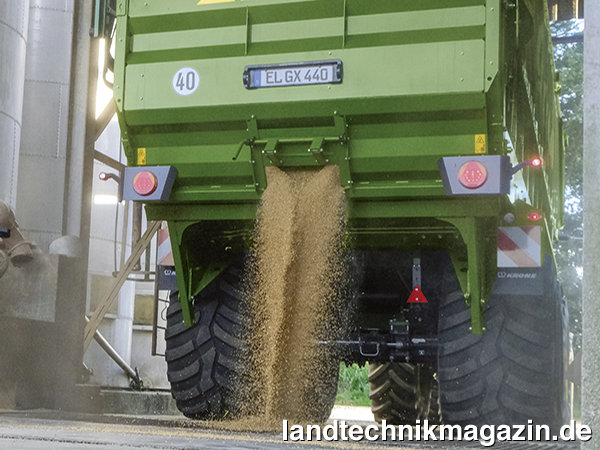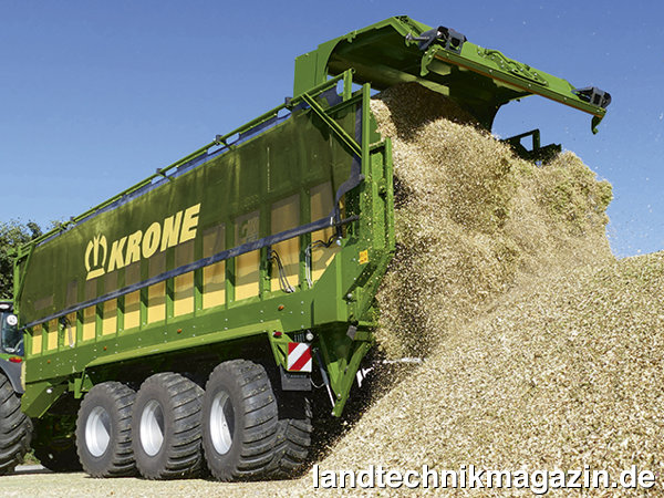 Angetrieben wird die Entladeeinheit über zwei Flachgliederketten mit laut Krone jeweils 25 t Bruchlast. Die Ketten sorgen zusammen mit Spannfedern, die sie mit der Vorderwand verbinden, für eine dauerhafte Spannung des Rollbandes, so dass dieses laut Krone auch bei Leerfahrten nicht flattert. Der Antrieb der Ketten erfolgt wiederum über zwei Hydraulikmotoren, wobei laut Hersteller beim GX 440 zwei 200 cm³-Motoren und beim GX 520 zwei 250 cm³-Motoren zum Einsatz kommen. Die Entladung des Wagens erfolgt laut Krone mit variabler Geschwindigkeit von bis zu 8 m/min oder im Schnellgang bis zu 16 m/min. Damit soll der GX 440 in circa 40 Sekunden vollständig entleert sein. Eine interessante neue Funktion bieten die GX Universal-Transportwagen mit ExactUnload. ExactUnload ermöglicht es, die gewünschte Abladelänge vorzuwählen, worauf die Abladegeschwindigkeit automatisch an die Fahrgeschwindigkeit des Schleppers angepasst wird, so dass der Wagen nach Erreichen der vorgegebenen Länge vollständig entleert ist. Praktisch ist diese Funktion zum Beispiel beim Anlegen eines neuen Silos von definierter Länge.