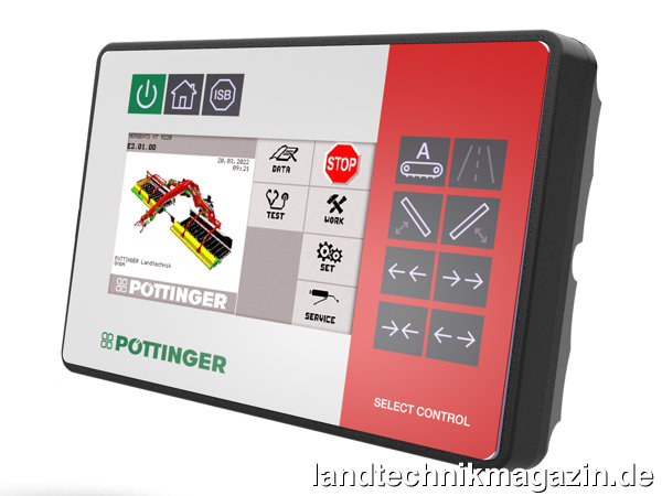 Beim neuen SELECT CONTROL wird laut Pöttinger auf ein bedienfreundliches Design geachtet. Mit den bedruckten Funktionstasten und dem nach Herstellerangaben 4,3 Zoll großen Farb-Touchdisplay lassen sich viele Maschinenfunktionen vorwählen und per Hydrauliksteuergerät bedienen oder auch direkt ansteuern. Die Helligkeit des Displays und der Tastatur lässt sich nach Bedarf einstellen, so dass zu jeder Tages- und Nachtzeit die optimale Beleuchtung gewährleistet sein soll. Die Mähwerke NOVACAT V 10000 können optional mit dem Terminal ausgestattet werden. Zusätzlich ist es für die Ladewagen BOSS der Serie 3000 erhältlich.