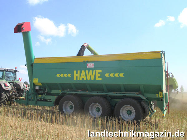 Mit 45 Kubikmetern Volumen, 20 Prozent mehr gegenüber dem bisherigen Topmodell, bietet HAWE nun ein Hochleistungsfahrzeug, das nach Herstellerangaben für die Arbeit mit Hochleistungsmähdreschern in Sachen Korntankvolumen und Durchsatz ausgelegt ist. Der neue ULW 4000 arbeitet mit einer laut HAWE auf 60 cm vergrößerten, hydraulisch schwenkbaren Überladeschnecke. Innerhalb von zwei Minuten ist die Ladung nach Herstellerangaben auf Straßenfahrzeuge überladen, die Überladeleistung pro Stunde beträgt laut HAWE 1.100 Tonnen.