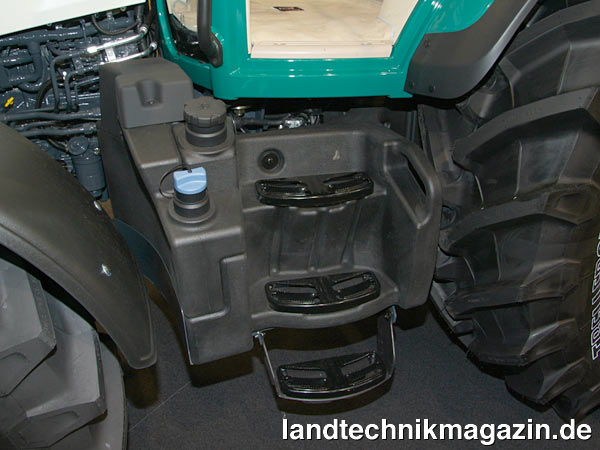 Wenn Arbos es beabsichtigt hatte, beim Design in der Landtechnik neue Akzente zu setzten, so ist dies voll und ganz gelungen. Formensprache sowie die Farbkombination Petrol/Weiß stechen angenehm und unverwechselbar aus der Traktorenlandschaft hervor. Ein Problem ist jedoch, dass sich das chice Design bis ins Innere der auf Silent-Blöcken gelagerten 4-Pfosten-Kabine fortsetzt, mit der Folge, dass die Innenverkleidung und selbst der Fußbodenbelag in einem hellen Cremeton gehalten sind. Das dürfte in der landwirtschaftlichen Praxis eher problematisch sein – der Fußboden wies nach wenigen Stunden Agritechnica bereits deutliche Schuhspuren auf. Ansonsten ist die Kabine – entsprechend der eher einfachen Ausstattung der Traktoren – übersichtlich gestaltet und bietet Annehmlichkeiten wie eine Lenkradverstellung (Höhe, Neigung), manuelle Klimaanlage und einen laut Arbos niedrigen Geräuschpegel von 72 dBA. Der Fahrersitz ist wahlweise mechanisch oder luftgefedert lieferbar und, um Frontladerarbeiten zu erleichtern, ist die Frontscheibe etwas ins Dach gezogen. Ein separates Frontladerfenster im Dach gibt es jedoch leider ebenso wenig wie einen Beifahrersitz. Die Arbos 5000 Traktoren können mit bis zu zehn Arbeitsscheinwerfern (vier hinten, sechs vorne) ausgerüstet werden. Was uns noch aufgefallen ist: Die Beschriftung der Bedienhebel wurde durch Aufkleber realisiert, die ihre Dauerhaltbarkeit wohl erst noch unter Beweis stellen müssen.