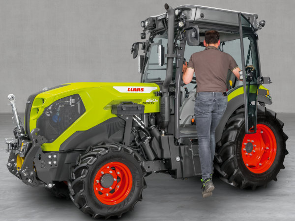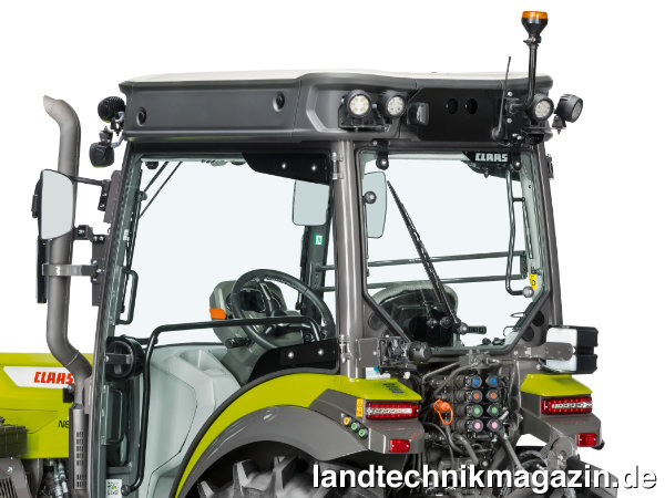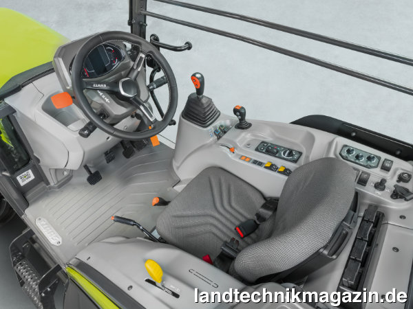 Neu bei den NEXOS 200 Comfort ist die Kabine, die jetzt vier statt wie bisher sechs Holme aufweist. Das verbessert nicht nur die Sicht, sondern ermöglicht auch bequemeres Ein- und Aussteigen – letzteres unterstützt durch die laut Claas weit öffnenden Türen. Dem Komfort kommt der ebene Kabinenboden ohne störenden Getriebetunnel zugute. Während die in der rechten Seitenkonsole angeordneten Bedienelemente ebenso erhalten blieben wie die Kontrollanzeigen im Lenkradinstrument, wurde die Lenksäule neu gestaltet. Darüber hinaus gibt es jetzt ein Lederlenkrad – eine Ausstattung, die von den größeren Claas Traktorenbaureihen bis zum XERION 12 sowie den JAGUAR Feldhäckslern und den Claas Mähdreschern bekannt ist. Eine weitere Neuheiten in der Kabine, ist die nun optional verfügbare DYNAMIC STEERING Funktion. Nach deren Aktivierung werden für Lenkanschlag zu Lenkanschlag laut Claas nur noch 1,5 Lenkradumdrehungen benötigt – zwei weniger als im normalen Lenkmodus, der auch für Straßenfahrten genutzt wird. Insbesondere bei Arbeiten in Weinbergen oder Plantagen mit oftmals mehreren hundert Wendevorgängen am Tag, ist DYNAMIC STEERING sicherlich eine sinnvolle Zusatzausstattung. Ebenfalls eine praktische Option, ist die neue Zapfwellenautomatik, die die Zapfwelle beim Anheben respektive Absenken der Anbaugeräte automatisch betätigt
