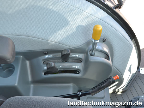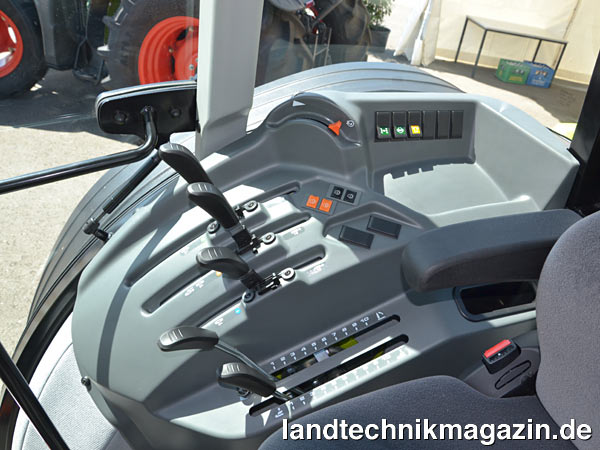 Für den Claas ELIOS 200 stehen wie bisher vier Getriebevarianten zur Auswahl. Topausstattung ist das 24x12-Getriebe mit 2-fach Lastschaltung TWINSHIFT und hydraulischer Wendeschaltung REVERSHIFT. Den REVERSHIFT-Bedienhebel links unter dem Lenkrad hat Claas überarbeitet, so dass er jetzt eine optimale Bedienung unabhängig von der Lenkradposition ermöglichen soll.