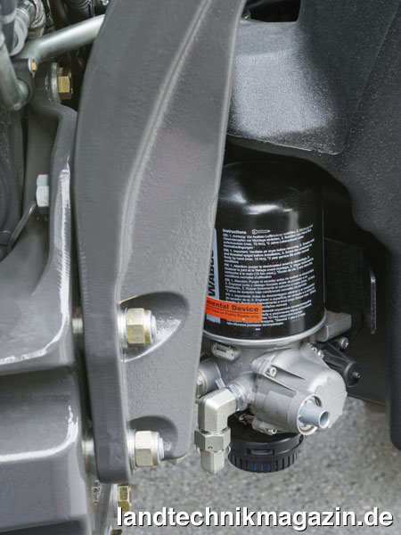 Neues gibt es bei der Bremsanlage, die bei allen neuen ARION 400 Modellen auf Wunsch mit einem Drucklufttrockner versehen werden kann, der vorhandenes Kondenswasser automatisch aus der Druckluft filtert, bevor sie in den Speichertank gelangt. Claas unterstreicht, dass dadurch verhindert werde, dass Ventile, Zylinder und Luftbehälter vorzeitig korrodieren oder durch gefrierendes Wasser beschädigt werden.