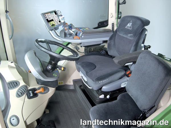 Für noch mehr Fahrkomfort bietet Fendt für den neuen 700 Vario eine weitere Komfortsitzvariante an. Der sogenannte Superkomfortsitz Evolution ist luftgefedert, hat eine Sitzheizung und verfügt zusätzlich über eine Niederfrequenzfederung sowie eine Lendenwirbelstütze und eine spezielle Klimatisierung. Auch der Beifahrersitz wurde für den 700 Vario komplett neu entwickelt und garantiert laut Fendt höchste Sicherheit und Komfort. Umgeklappt kann der gepolsterte Sitz auch als Schreibablage genutzt werden.