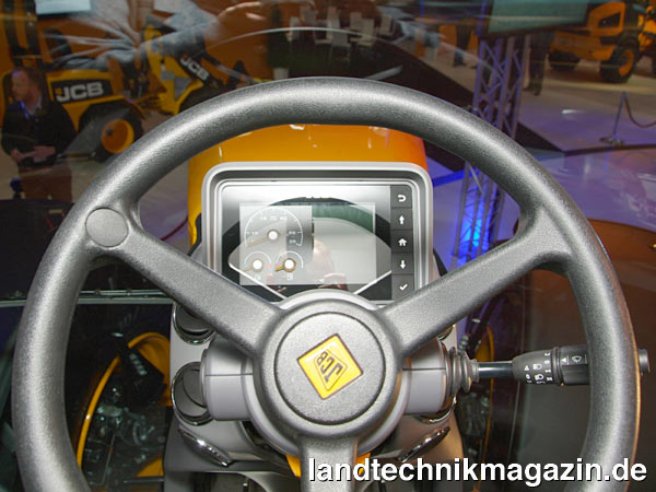 Die neu gestaltete, schmale Lenksäule mit dem ebenfalls neuen Armaturenbrett beim JCB Fastrac 4000 trägt mit zur verbesserten Sicht nach vorne bei.