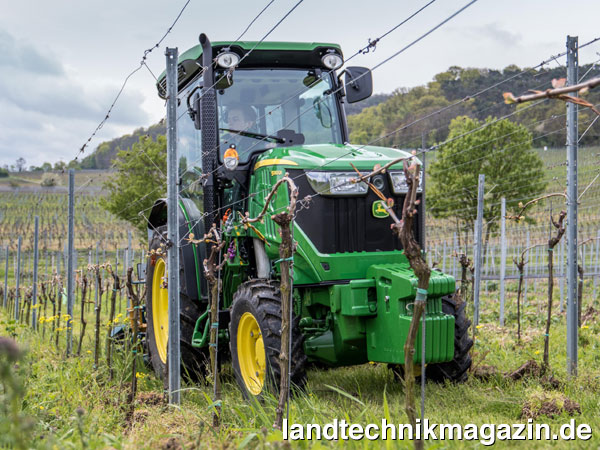 Beim Getriebe besteht für die 5G Schmalspurtraktoren nach wie vor die Auswahl zwischen vier Optionen. Verfügbar sind ein 12V/12R-Gang-Getriebe mit mechanischer Wendeschaltung, ein 24V/24R-Gang-Getriebe mit mechanischer Wendeschaltung und mechanischer 2-fach-Lastschaltung, ein 24V/24R-Gang-Getriebe mit mechanischer Wendeschaltung und elektrohydraulischer 2-fach-Lastschaltung sowie ein 24V/12R-Gang-PowrReverser-Getriebe mit lastschalbarer Wendeschaltung und elektrohydraulischer 2-fach-Lastschaltung. Neu ist, dass das 24V/12R-Gang-PowrReverser-Getriebe jetzt auch für die 5GL-Modelle als Alternative zum 24V/24R-Gang-Getriebe mit mechanischer Wendeschaltung und mechanischer 2-fach-Lastschaltung angeboten wird. Die übrigen Ausführungen, 5GV, 5GN und 5GF, können mit allen vier Getriebe-Optionen ausgestattet werden und sind darüber hinaus in Kombination mit dem 12V/12R-Gang-Getriebe wahlweise als Hinterrad- oder Allrad-Maschinen lieferbar, während der 5GL ausschließlich mit Allradantrieb verfügbar ist. Stichwort Allradantrieb: Der Lenkwinkel der Allrad-Vorderachse wurde laut John Deere auf bis zu 43° erhöht, wodurch sich – in Kombination mit einer reduzierten Gesamtlänge der 5G Spezialtraktoren – der Wenderadius um bis zu 15 % verringert haben soll. Das 12V/12R-Gang-Getriebe bietet eine Höchstgeschwindigkeit von 30 km/h, alle übrigen Getriebe-Ausführungen 40 km/h.