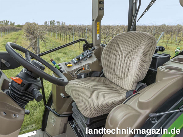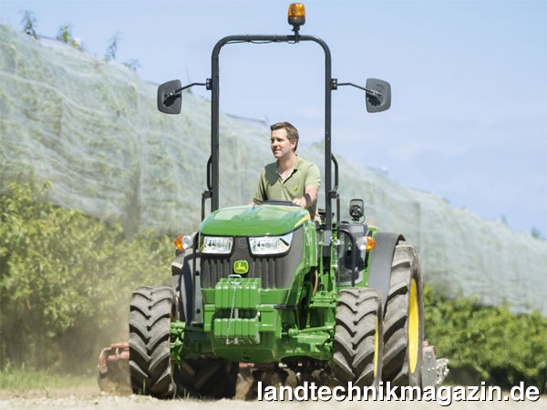 Beim Getriebe besteht für die 5G Schmalspurtraktoren nach wie vor die Auswahl zwischen vier Optionen. Verfügbar sind ein 12V/12R-Gang-Getriebe mit mechanischer Wendeschaltung, ein 24V/24R-Gang-Getriebe mit mechanischer Wendeschaltung und mechanischer 2-fach-Lastschaltung, ein 24V/24R-Gang-Getriebe mit mechanischer Wendeschaltung und elektrohydraulischer 2-fach-Lastschaltung sowie ein 24V/12R-Gang-PowrReverser-Getriebe mit lastschalbarer Wendeschaltung und elektrohydraulischer 2-fach-Lastschaltung. Neu ist, dass das 24V/12R-Gang-PowrReverser-Getriebe jetzt auch für die 5GL-Modelle als Alternative zum 24V/24R-Gang-Getriebe mit mechanischer Wendeschaltung und mechanischer 2-fach-Lastschaltung angeboten wird. Die übrigen Ausführungen, 5GV, 5GN und 5GF, können mit allen vier Getriebe-Optionen ausgestattet werden und sind darüber hinaus in Kombination mit dem 12V/12R-Gang-Getriebe wahlweise als Hinterrad- oder Allrad-Maschinen lieferbar, während der 5GL ausschließlich mit Allradantrieb verfügbar ist. Stichwort Allradantrieb: Der Lenkwinkel der Allrad-Vorderachse wurde laut John Deere auf bis zu 43° erhöht, wodurch sich – in Kombination mit einer reduzierten Gesamtlänge der 5G Spezialtraktoren – der Wenderadius um bis zu 15 % verringert haben soll. Das 12V/12R-Gang-Getriebe bietet eine Höchstgeschwindigkeit von 30 km/h, alle übrigen Getriebe-Ausführungen 40 km/h.