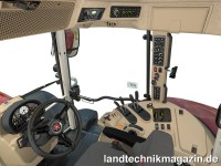 Das Design der neuen Massey Ferguson MF 7S wurde dem aktuellen Familiendesign angepasst, das das Unternehmen mit den neuen MF 8S einführte und als Neo-Retro bezeichnet. In diesem Fall bedeutet das, die Kabine der Vorgängerbaureihe silbern zu lackieren und die Motorhaube neu zu gestalten. Der silberne Streifen an den Flanken, auf dem auch der Firmenname prangt, wird unterbrechungslos bis zum zentralen Kühleremblem fortgesetzt und mit einem Ausläufer ergänzt, der den deutlich massiver wirkenden Kühlergrill einrahmt. Diese Massivität wird einerseits durch ein anderes Material und andererseits durch Querrippen verursacht, die den Begriff „Bullenfänger“ flüstern. Positiv auf den Sichtbereich dürfte sich der deutlich schlankere Auspuff auswirken, der der gebogenen Form des Kabinen-Holmes folgt und so weniger als plumpe Notwendigkeit sondern mehr als Designelement in Erscheinung tritt.
