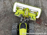 Ungemähte Streifen sind beim Einsatz von Mähkombinationen bei Kurvenfahrten ein bekanntes Problem. Verschiebbare Heckmäheinheiten können hier nur bedingt Abhilfe schaffen, denn selbst wenn die Überlappung eigentlich passen würde, kann das Futter gerade bei breiter Bereifung und großer Spurweite am Traktor festgefahren werden, so dass es von den Heckmähern nicht mehr erfasst werden kann. Eine Lösung bieten hier die schwenkbaren Frontkraftheber-Unterlenker der Hans Sauter GmbH (www.sauter-stetten.com). Claas Saulgau erkannte dies bereits im Prototypenstadium der schwenkbaren Unterlenker, so dass Sauter und Claas diese in gemeinsamen Feldtests insbesondere für die Verwendung mit Claas Mähkombinationen an die Frontkraftheber der AXION 800 und 900 Traktoren angepasst haben. Sauter merkt an, dass sich die Active Float Entlastung mittels Hydraulikzylindern statt Ferdern der Claas Mähwerke als vorteilhaft bei Verwendung der Schwenkunterlenkung erweist, da die Längenänderung beim Schwenken hydraulisch zwischen den Zylindern ausgeglichen wird.