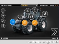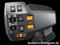 Aber nun zur wichtigsten Neuerung im Valtra S394: Die in Finnland gestaltete SmartTouch Multifunktions-Armlehne. Zentrale Komponente der Armlehne ist der vertikal auf der Armlehne angeordnete Multifunktions-Fahrhebel, mit dem sich die Geschwindigkeit durch Drücken oder Ziehen variieren lässt, und der Hydraulikbedienung, Hubwerk- sowie Zapfwellensteuerung in sich vereint. Weiches Gummimaterial sorgt für eine sichere Handauflage und die Gestaltung bietet die Möglichkeit, den Daumen aufzulegen. Kaum weniger zentral als der Fahrhebel präsentiert sich das 9-Zoll-Touchscreen-Terminal, das den Benutzer durch ein interaktives Bild des Traktors durch die Funktionen führt; so werden auch exotischere Anpassungen einfach auffindbar. Das Terminal erlaubt auch den Zugriff auf erweiterte Funktionen, wie das U-Pilot-Vorgewendemanagement, ISOBUS, Auto-Guide und andere Precision Farming-Themen, so dass die Notwendigkeit eines weitere Monitors entfällt und die Sicht aus der Kabine verbessert wird. Frei programmierbare Funktionstasten und die Möglichkeit der Speicherung einer laut Valtra unbegrenzten Anzahl von Profilen für verschiedene Personen und Arbeitsgeräte runden die Flexibilität der neuen SmartTouch Multifunktions-Armlehne ab.