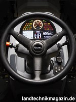 Mit vier Gängen, vier Lastschaltstufen und lastschaltbarer Wendeschaltung wartet das HiTech-4-Getriebe mit immerhin 16 Vorwärts- und 16 Rückwärtsgängen auf. Auf Wunsch ist eine zusätzliche Kriechgang-Untersetzung für Geschwindigkeiten nach Herstellerangaben von unter 100 m/h bei einer Drehzahl von 1.400 U/min möglich, die eine Verdoppelung der Gangzahl auf 32 vorwärts und ebenso viele rückwärts bewirkt. Laut Valtra verfügen die A-Serie HiTech 4 Traktoren über sechs Geschwindigkeiten im Bereich von 4 bis 12 km/h – das sind nicht mehr als beim einfachen Synchron-Getriebe (siehe Artikel „Valtra stellt die Traktoren der neuen A4-Serie vor“). Der Reiz des HiTech-4-Getriebes dürfte also weniger in der höheren Gangzahl als vielmehr im Vorhandensein von Lastschaltstufen sowie in der bequemen Betätigung sowohl der Gang- als auch der Lastschaltstufen über Wippschalter im in der rechten Seitenkonsole platzierten Valtra Grip-Bedienhebel liegen. Darüber hinaus bieten die Valtra A104 HiTech 4 und der A114 HiTech 4 die Möglichkeit einer automatisierten Betätigung der Lastschaltstufen. Selbstverständlich verfügen auch die HiTech-4-Modelle über die Funktion AutoTraction zum Anhalten und Losfahren rein über die Bremse. Ebenso gibt es die elektrohydraulisch betätigte Zapfwelle wie bisher wahlweise mit den Drehzahlen 540/1000 oder 540/540E/1000. Neu ist allerdings, dass A104 HiTech 4 und A114 HiTech 4 jetzt bereits ab Werk mit Frontzapfwelle und Frontkraftheber ausgestattet werden können.