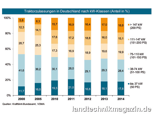 Analysiere man die Entwicklung des vergangenen Jahres nach Leistungsklassen, so sei erneut ein beachtliches Größenwachstum erkennbar. Schließlich verfüge mittlerweile jeder fünfte neu zugelassene Schlepper über eine Motorleistung von mehr als 200 PS (147 kW). Der Durchschnittswert bei Neutraktoren für landwirtschaftliche Zwecke liege mittlerweile bei 155 PS. Überproportionale Investitionen in die Traktorflotten der großen Ackerbaubetriebe in Ostdeutschland sowie Schleswig-Holstein haben diesen Trend 2014 laut VDMA weiter befeuert.