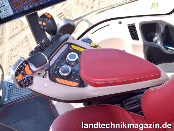 Am deutlichsten unterscheidet sich die Case IH Magnum AFS Connect Baureihe von den Vorgängern beim Blick in die Surveyor-Kabine. Die neue Kabine bietet eine vollverglaste Tür ohne Mittelholm, durch die die Sicht verbessert und der Einstig erleichtert wird. Apropos Einstieg. Hierfür wurde ein Funkschlüssel mit integrierter Wegfahrsperre entwickelt. Die vier Anzeigen am A-Holm wurden durch ein Smartscreen-Display ersetzt, das die wichtigsten Betriebsinformationen anzeigt. Die neu gestaltete Multicontroller-Armlehne, die über acht frei belegbare Bedientasten, einen Multicontroller-Hebel mit vier programmierbaren Tasten für Zusatzsteuergeräte und ISOBUS, Hotkey-Tasten für Schnellzugriffe, den Encoder-Drehknopf mit Drückfunktion und einen optionalen Joystick verfügt, bietet die bereits erwähnten farblich markierten, frei belegbaren Steuergerätehebel. Statt des AFS Pro 700 Monitors kommt der deutlich größere AFS PRO 1200 Touchscreen Monitor mit AFS Vision Pro Betriebssystem und vier Kamera-Eingängen zur Anwendung. Case IH hat drei Kabinenpakete geschnürt: Deluxe, Deluxe Technology und Luxury. Die Deluxe Kabine umfasst unter anderem Sitze mit Stoffbezug, wohingegen die Deluxe Technology Kabine darüber hinaus eine Sitzheizung, eine mechanische Kabinenfederung, elektrisch verstellbare und mechanisch teleskopierbare Weitwinkelspiegel sowie werksseitig montierte Front- und Heckkameras beinhaltet. Die Luxury Kabine lässt sich sofort an den roten Ledersitzen, dem Lederlenkrad und der roten Armlehnen-Auflage erkennen – weniger offensichtlich sind die semi-aktive hydraulische Federung der Kabine und die aktive Federung, Heizung sowie Belüftung des Traktorsitzes, der sich außerdem um 40° nach rechts und links schwenken lässt.